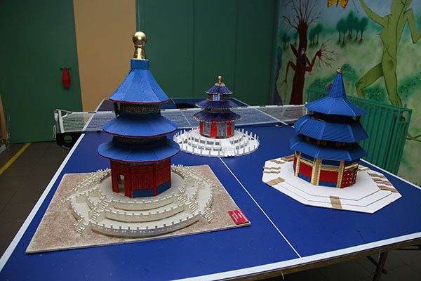 接着,双方学校的孩子们通过使用彼此的语言来给对方写名字的活动进行了热身互动,现场气氛马上热闹了起来。然后,中方在希腊校方老师的带领下,参观了这所虽然不大但却精致美好的校园。学校精心布置了中国文化展,有匠心独运的中国汉字立体剪纸、中国和希腊的代表性建筑的手工模型、关于扇子和龙的绘画展览,还特别布置了中国航天的发展历史,以及中国地图和主要的自然人文景观。